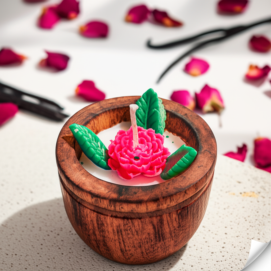 Vibrant Floral Centerpiece: Adorn your living space with this captivating candle featuring a vivid pink flower and green leaves, bringing a splash of natural beauty to any room.