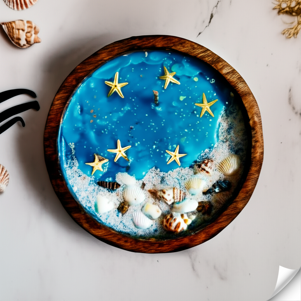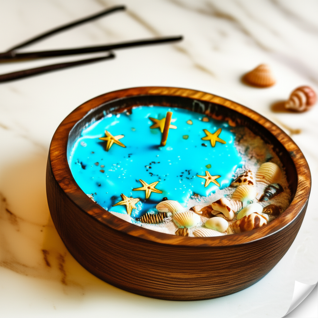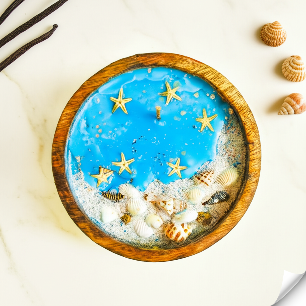 Coastal Escape Design: Immerse yourself in a serene seascape with this beautifully crafted candle, featuring vibrant blue wax resembling the ocean, complete with embedded seashells, sandy textures, and golden starfish, all housed in a rustic wooden bowl.