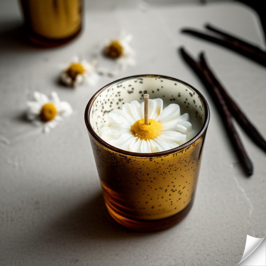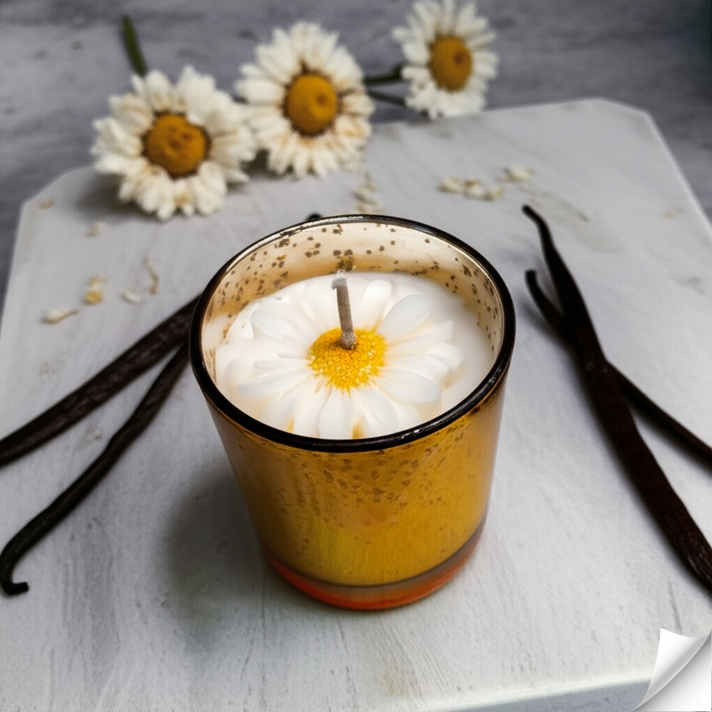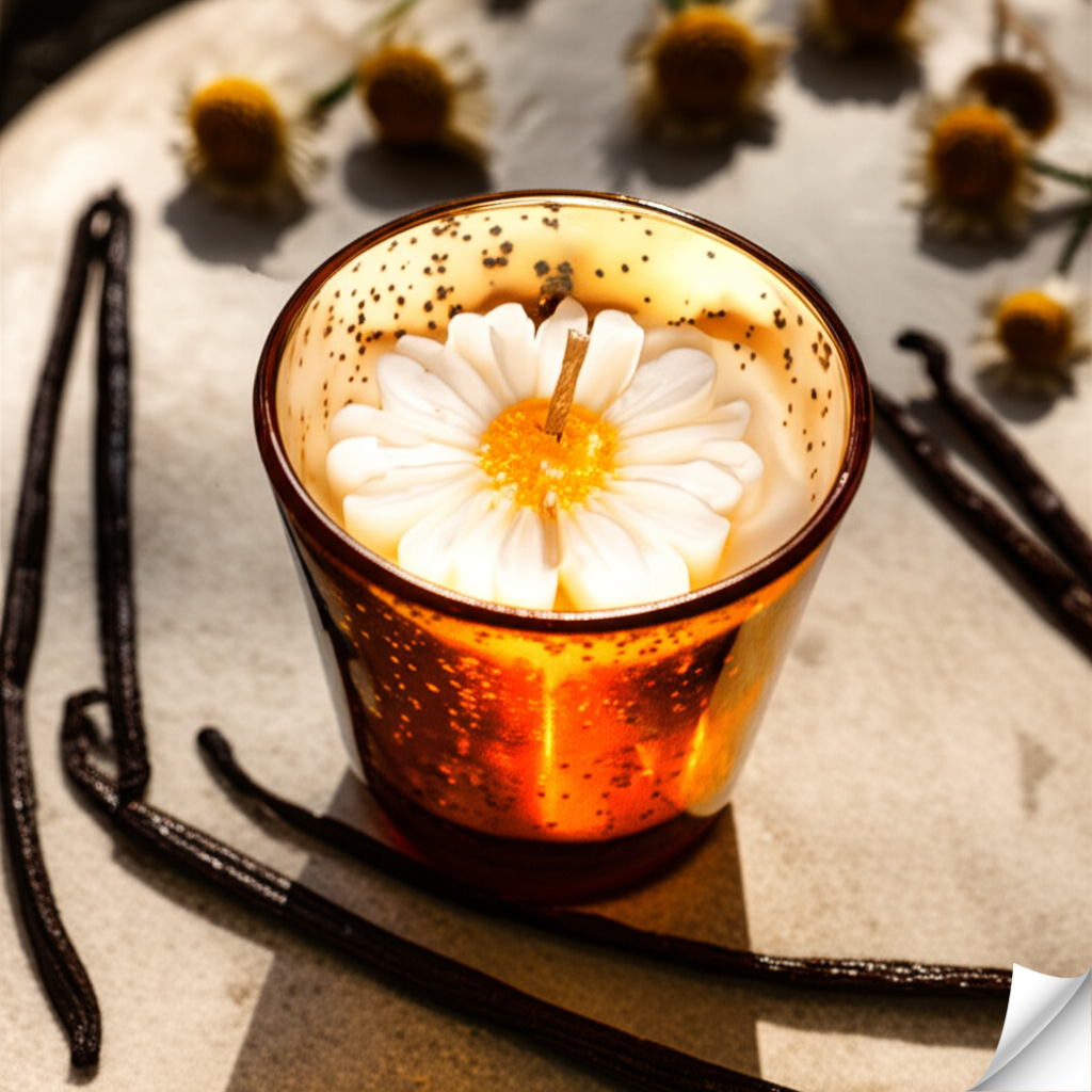 Dazzling Visual Appeal: Housed in a unique gold/copper speckled glass jar that shimmers when lit, complemented by a delicate white daisy wax embed for a touch of elegance.